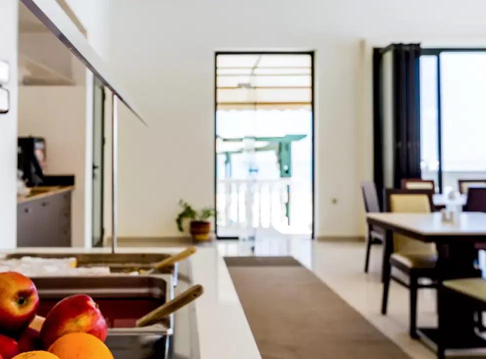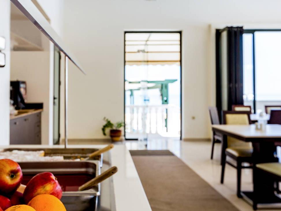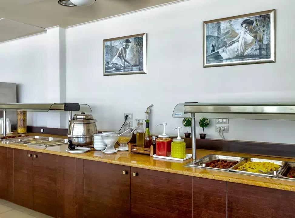 Snídaně (08:00-10:00), oběd (12:30-14:30), večeře (18:00-20:00), všechna jídla se podávají formou bufetu. Obědy a večeře jsou zaměřeny na mezinárodní a řeckou kuchyni . Občerstvení (16:00-17:00) - sendviče, pizza, koláče. Bar (11:00-23:00) Místní alkoholické a nealkoholické nápoje: pivo, víno, ouzo, vodka, gin, rum, brandy, káva, čaj, džusy, perlivé nápoje.
