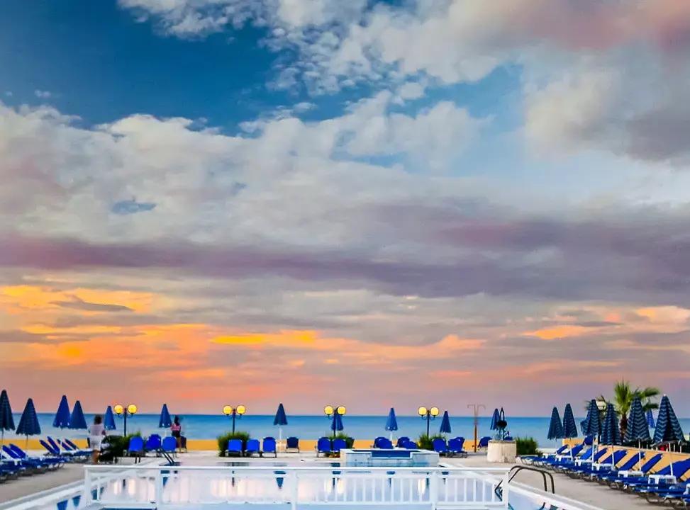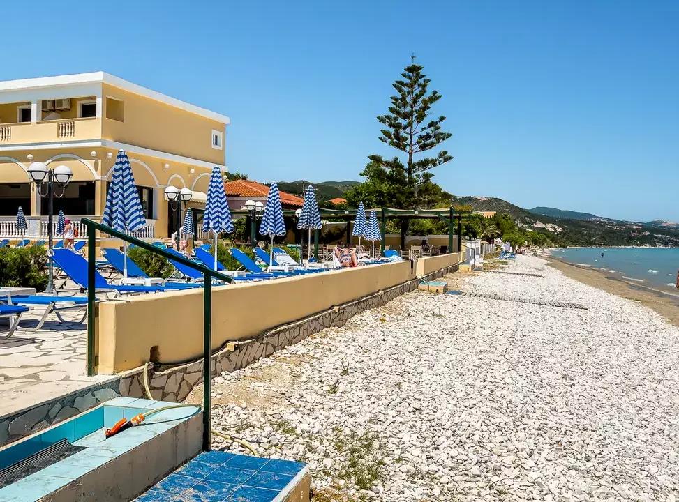 Hotel se nachází přímo na skalnaté pláži. Na druhé straně, přibližně 400 metrů od hotelu, se nachází písečná pláž Alykes s placeným plážovým servisem.